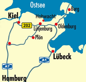 Aus Richtung Hamburg die A7 weiter auf der A215 abfahren auf die B76 Richtung Lübeck, nach etwa 10 km biegen Sie auf die B202 in Richtung Lütjenburg; hinter Lütjenburg biegen Sie links ab nach Hohwacht. Kurz nach Haßberg fahren Sie bitte rechts, dann erkennen Sie auf der linken Seite ein Siedlungsgebiet. Biegen Sie rechts ab und dann wieder rechts in den Kranichring, jetzt geht es nur noch gerade aus... |